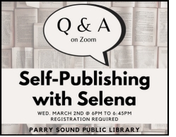 Are you thinking or planning on self-publishing a book? The Parry Sound Public Library would like to remind the public of a very interesting webinar tomorrow evening, Wednesday, March 2, 2022 at 6:00 PM for a ZOOM Q&A with library staff member Selena. Learn the ins and outs of self-publishing a book. Register by e-mailing This email address is being protected from spambots. You need JavaScript enabled to view it.. The event is free!